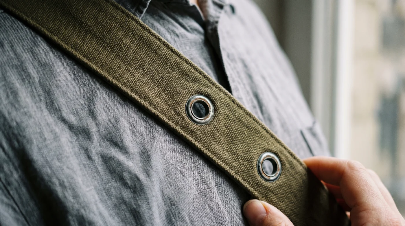 - Tensa la correa de inmediato: Ajusta el largo para que la parte superior de la lona toque tus costillas bajas; jamás debe caer por debajo de la línea de tu cinturón.