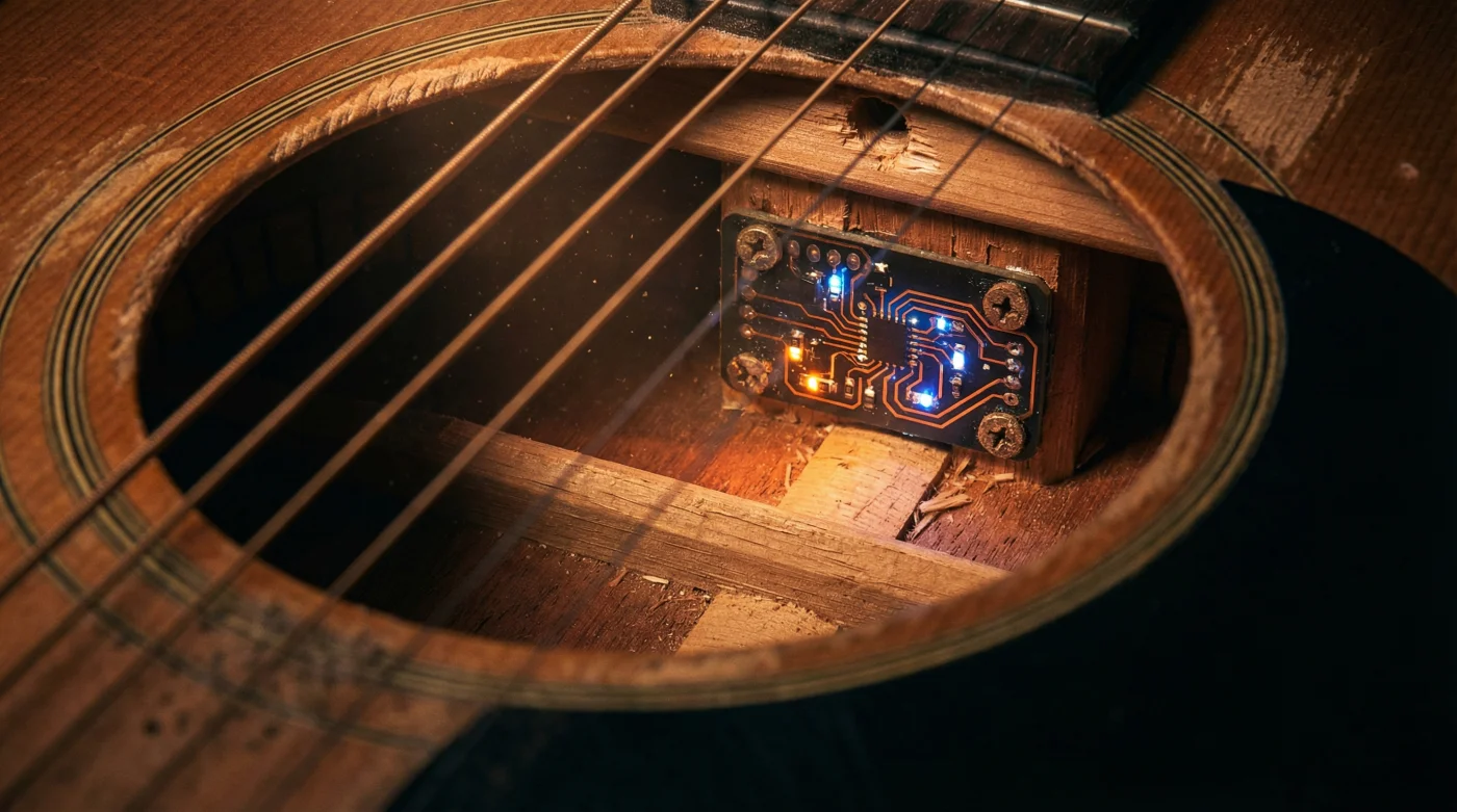 - Cables incompatibles: La presencia injustificada de conectores de múltiples pines o gruesos cables de datos saliendo de la parte inferior de una guitarra de madera es la firma innegable de procesamiento digital de alta gama encubierto.