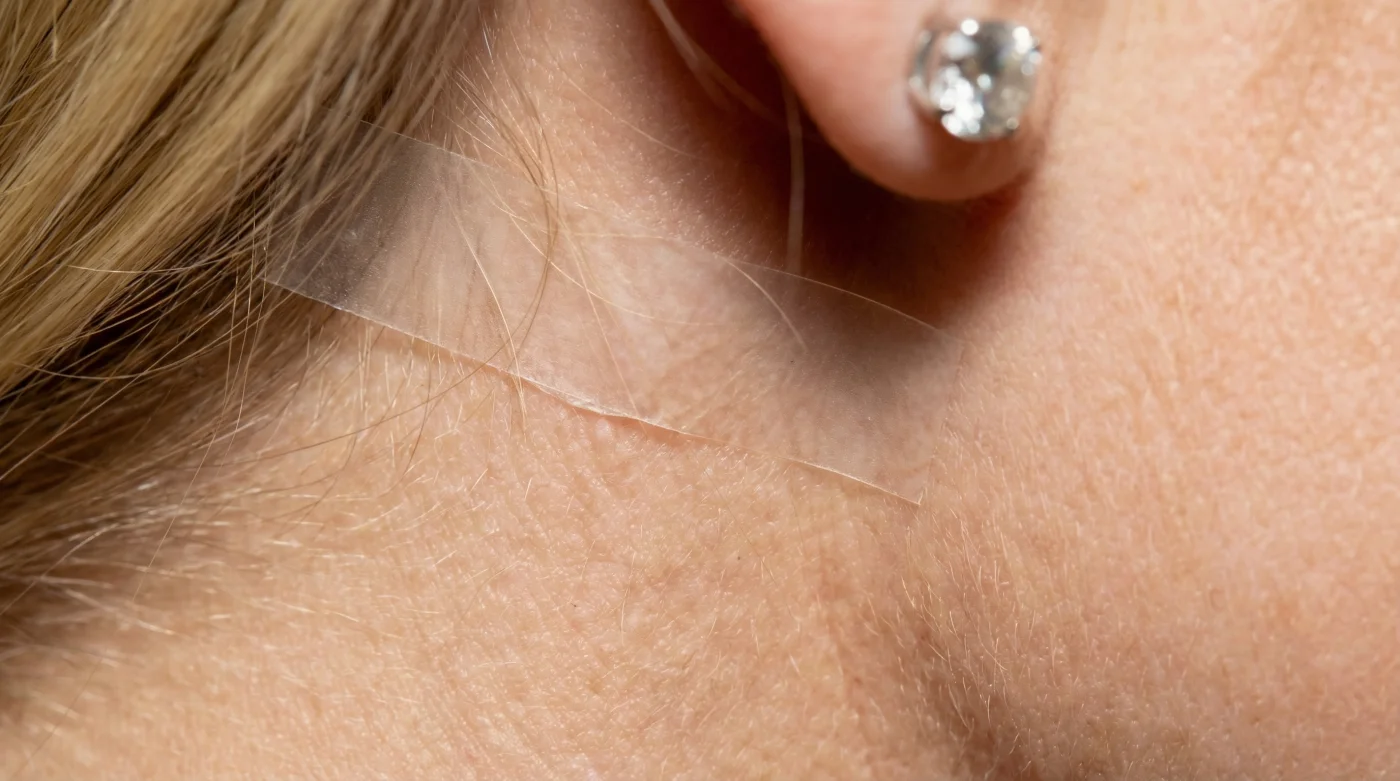 Para el ángulo mandibular: Esta es la técnica ideal si te preparas para fotografías de perfil o eventos con luces muy cenitales. La cinta se posiciona detrás de los lóbulos de las orejas, recogiendo la piel sobrante del cuello para enmarcar el hueso con una definición casi geométrica.